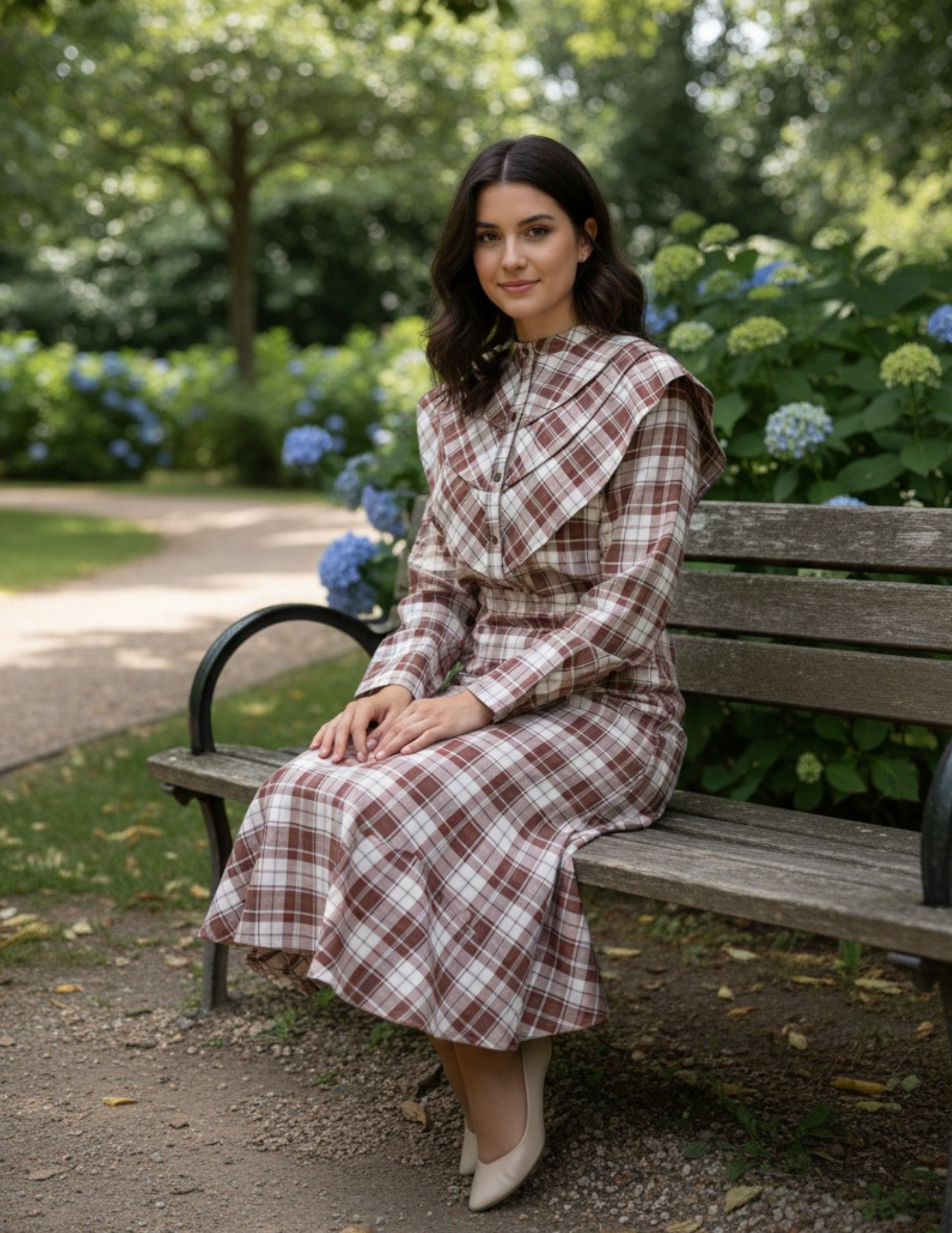 Designed in warm shades of chestnut and cream, it combines a structured blouse with a defined yoke and a wide, flowing skirt that falls naturally and with movement.