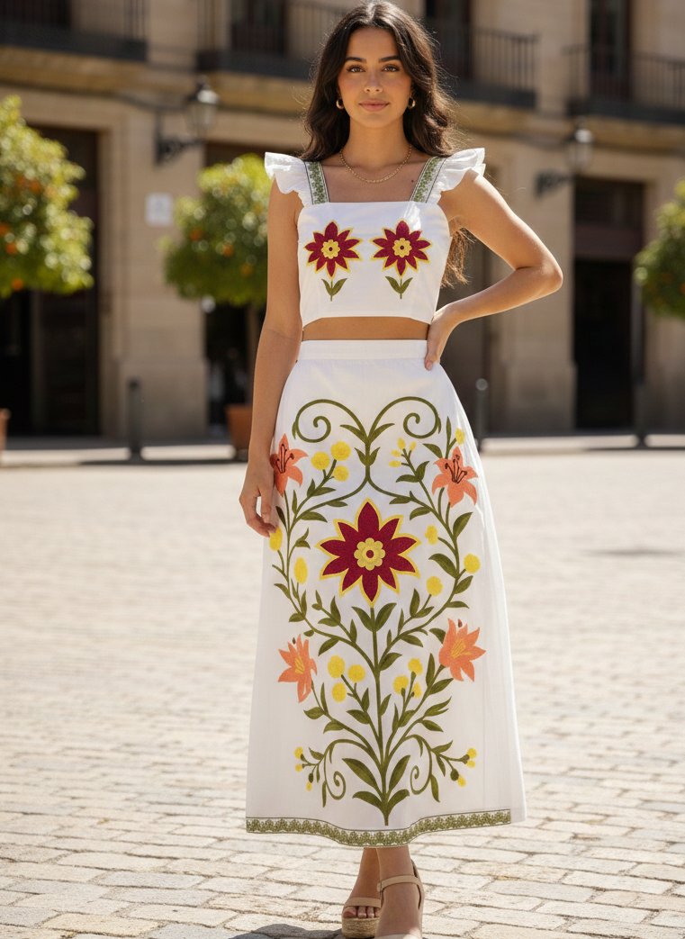 A fresh, resort-ready co-ord in an off-white base, elevated with delicate floral embroidery for a soft, artisanal finish. Designed for effortless summer styling, the Alma Sol Set blends comfort with refinement, making it ideal for warm-weather wardrobes and boutique merchandising. Wear it together for a complete statement look or style the pieces separately for versatile outfit options.