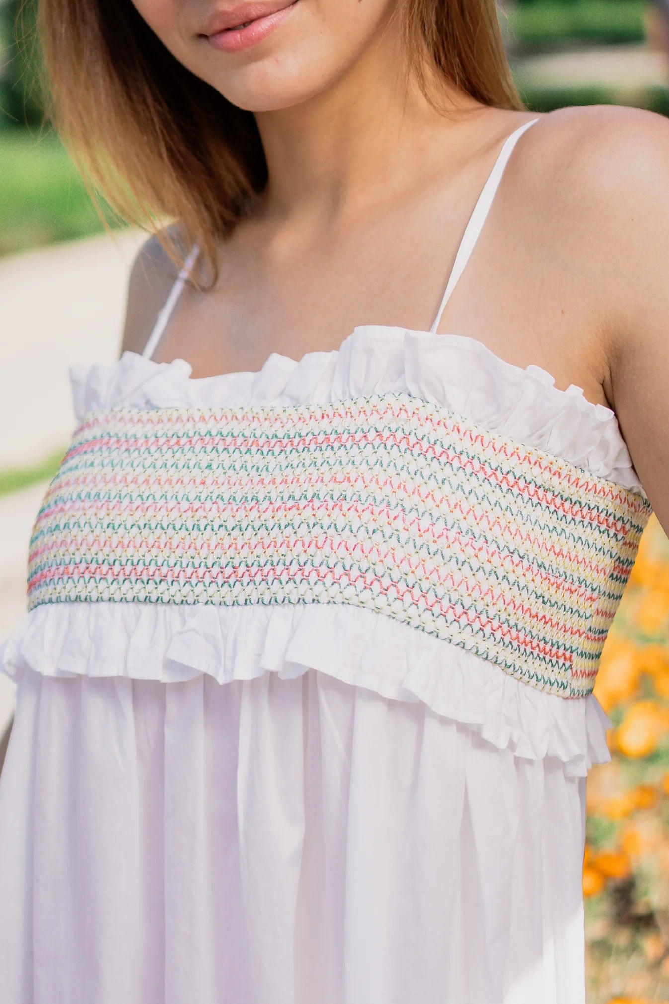 This white cotton dress features delicate floral embroidery at the hem, adding a touch of elegance to its simple design. With its cool and comfortable style, it's perfect for everyday wear, offering a sophisticated and feminine look.