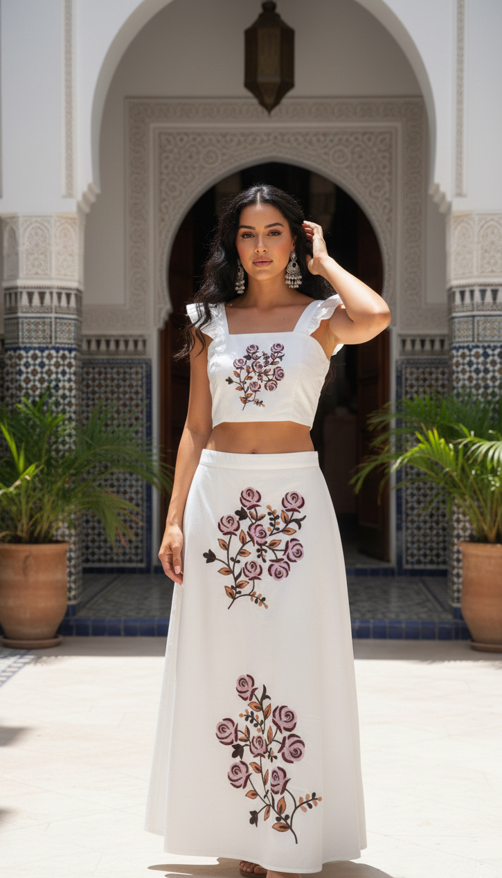 The Brava Set is an elevated off-white co-ord featuring purple floral embroidery that adds contrast and a distinctive bohemian touch. Crafted for destination dressing, this set offers an easy silhouette with a polished finish—perfect for clients seeking standout embroidery with effortless wearability. Strong for travel edits, resort drops, and summer capsule merchandising.