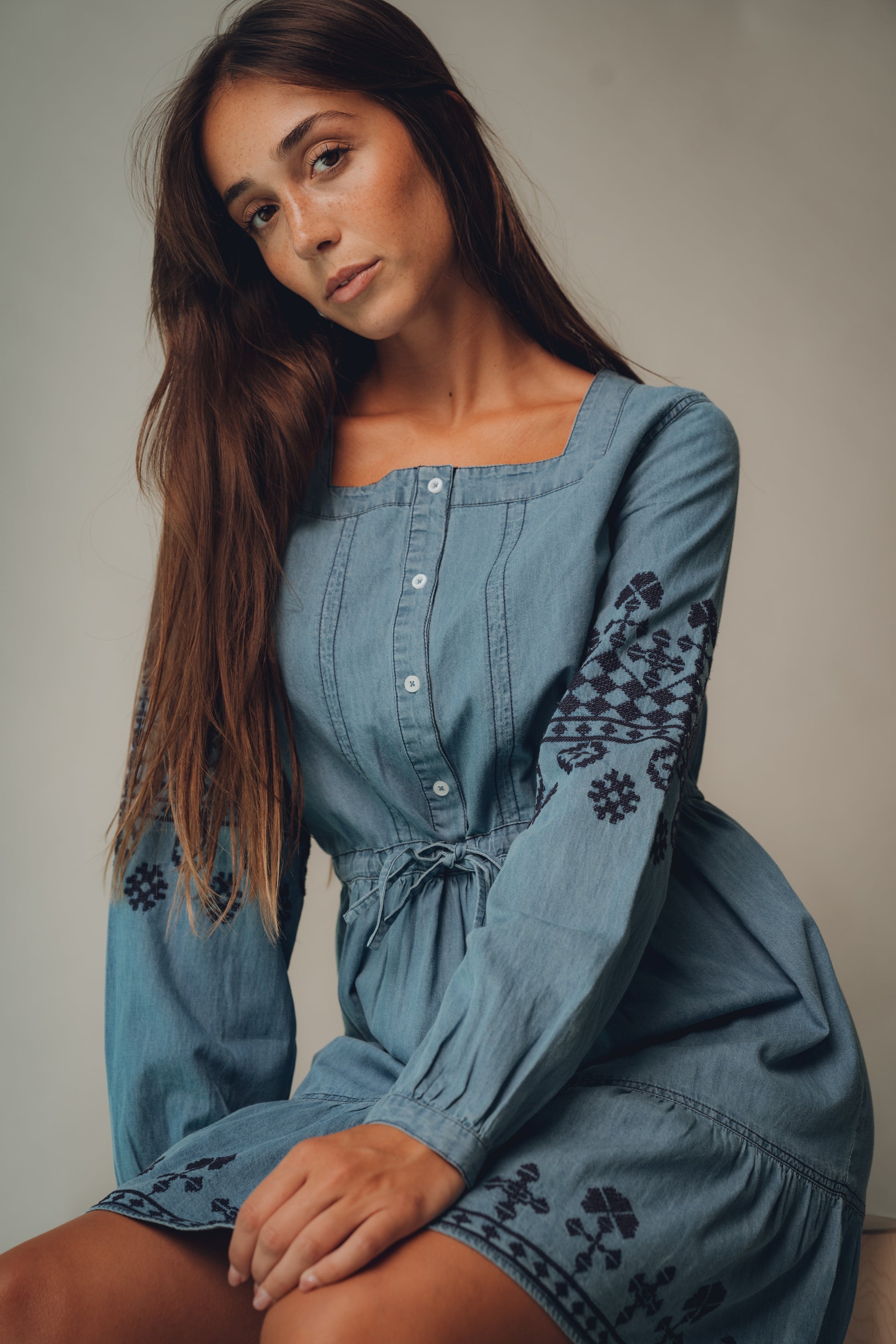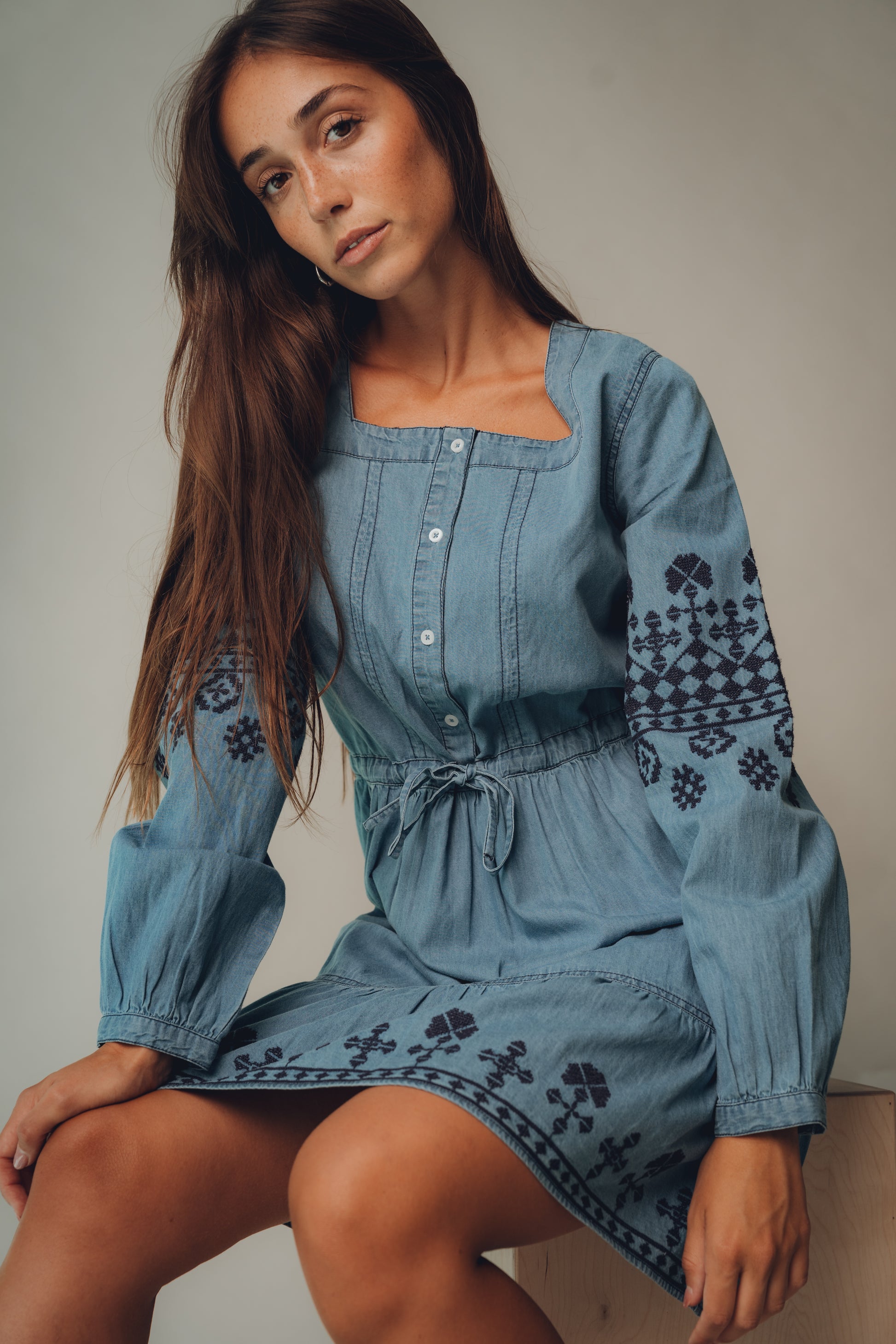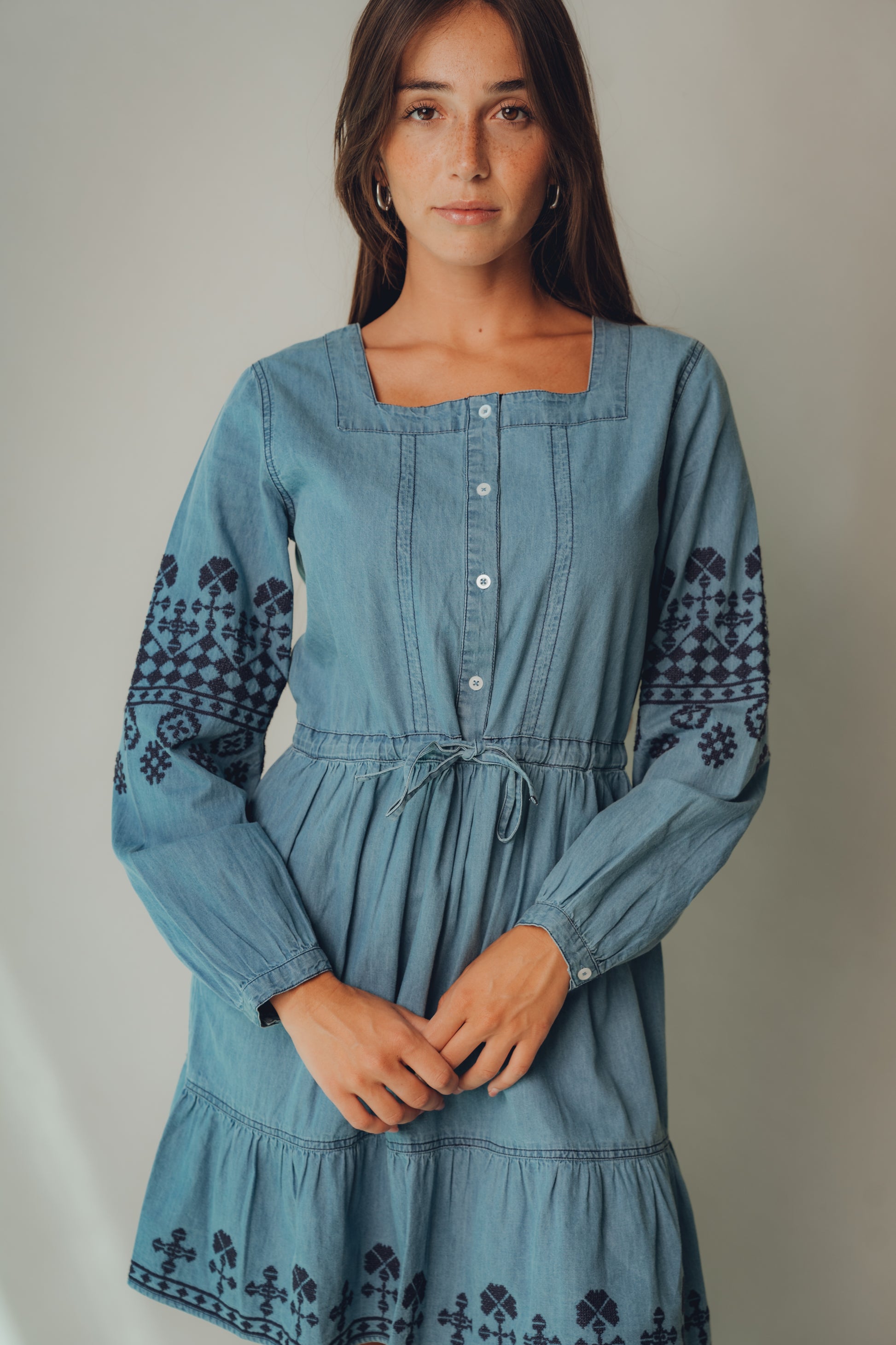 This midi dress, crafted from cotton, has a soft denim look. It features a square neckline, a button-front closure to the waist, and a straight silhouette with a fitted waist and floral and geometric embroidery on the sleeves and hem. A versatile dress that will accompany you throughout your transition.