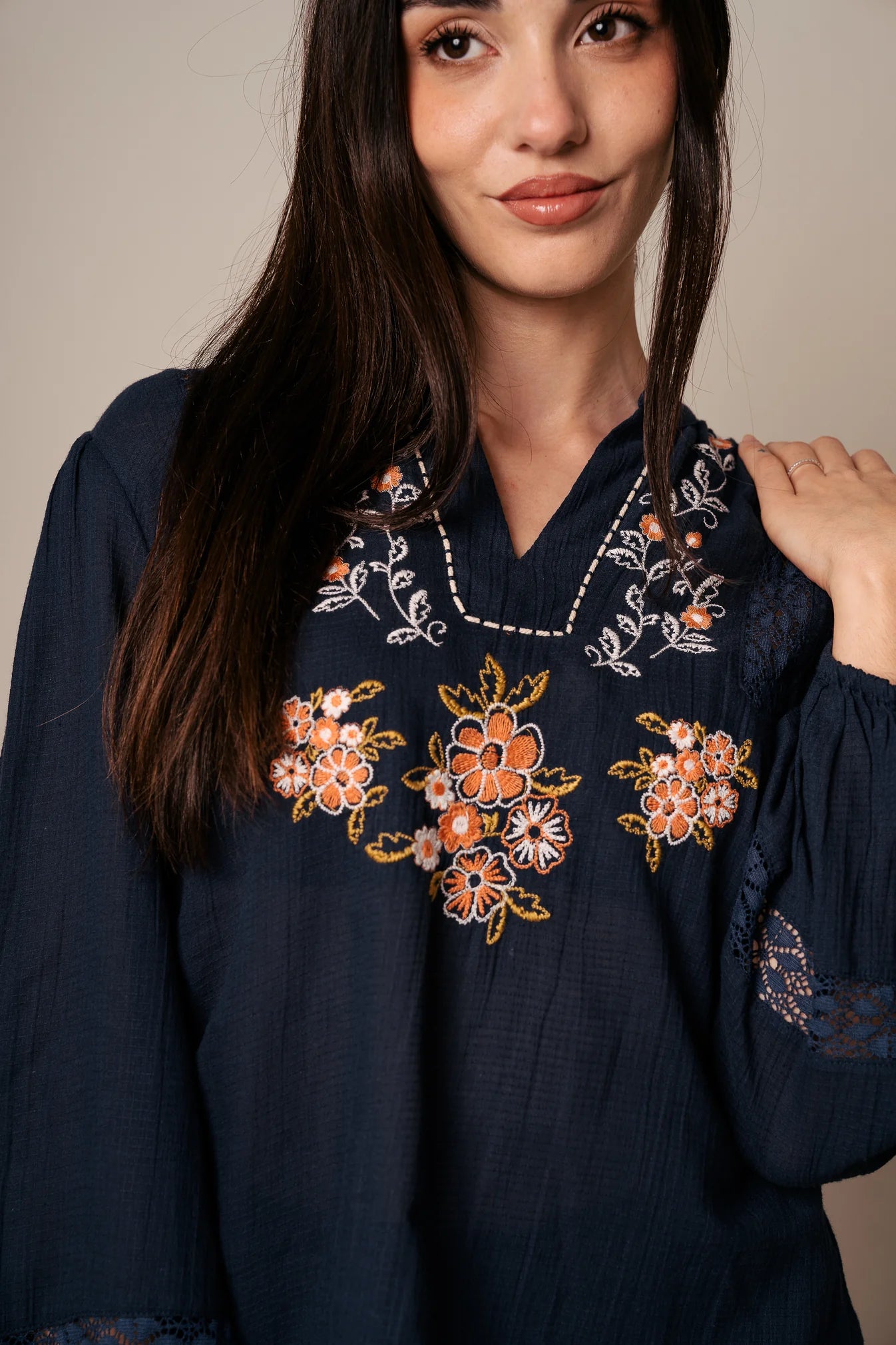 This beautiful blue blouse features intricate embroidery that adds a touch of elegance and charm to its classic design. Made from a soft, breathable fabric, it offers both comfort and style.