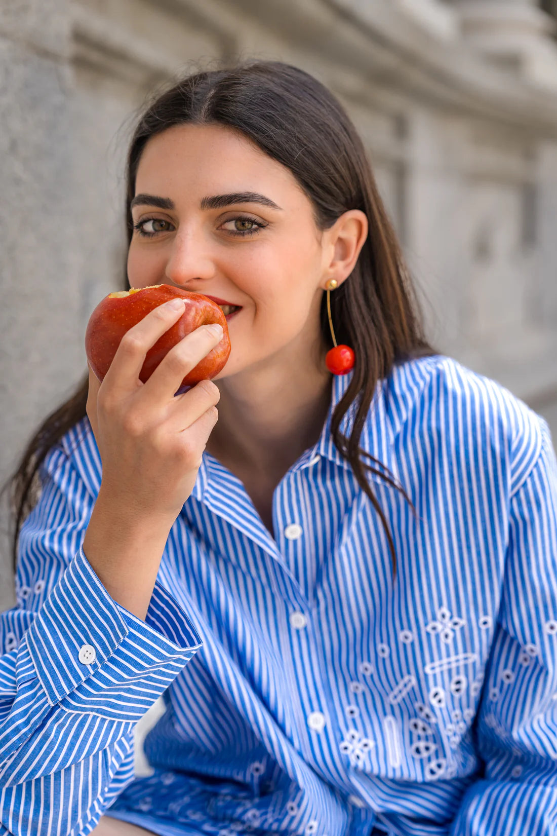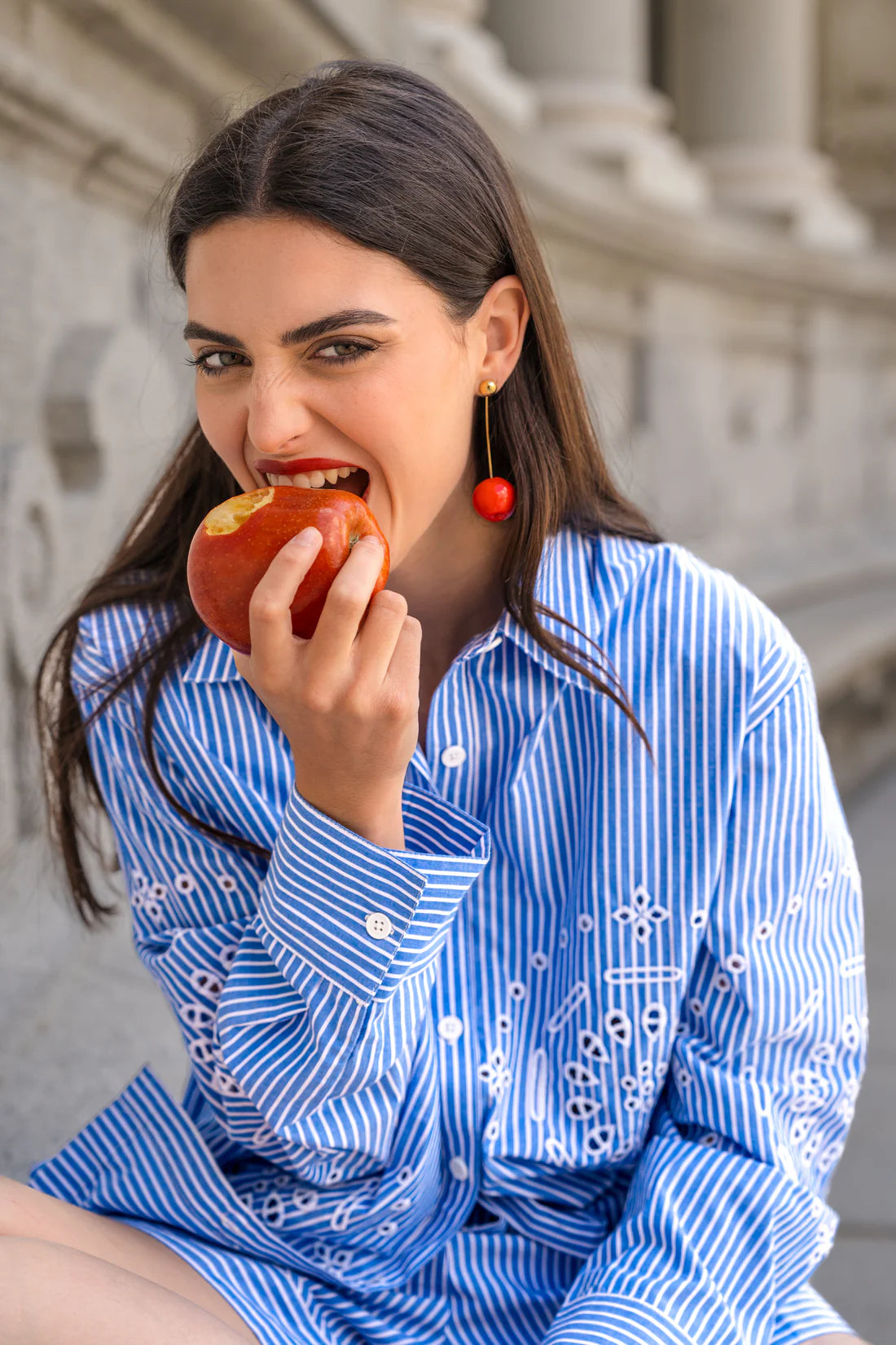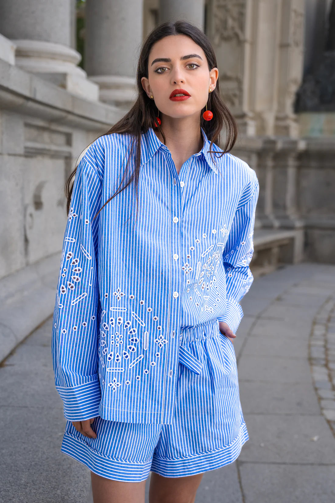 The Marsella Total Look Set consists of a shirt and shorts made of 100% cotton. The shirt features blue and white stripes with floral embroidery on the front panel and sleeves, and a button closure. The shorts come with a tie belt at the waist. A casual yet polished set that gives the appearance of a more formal look. The shirt is ideal for all types of occasions.