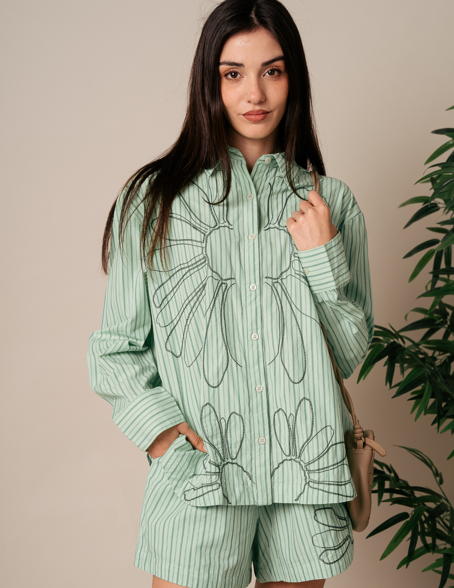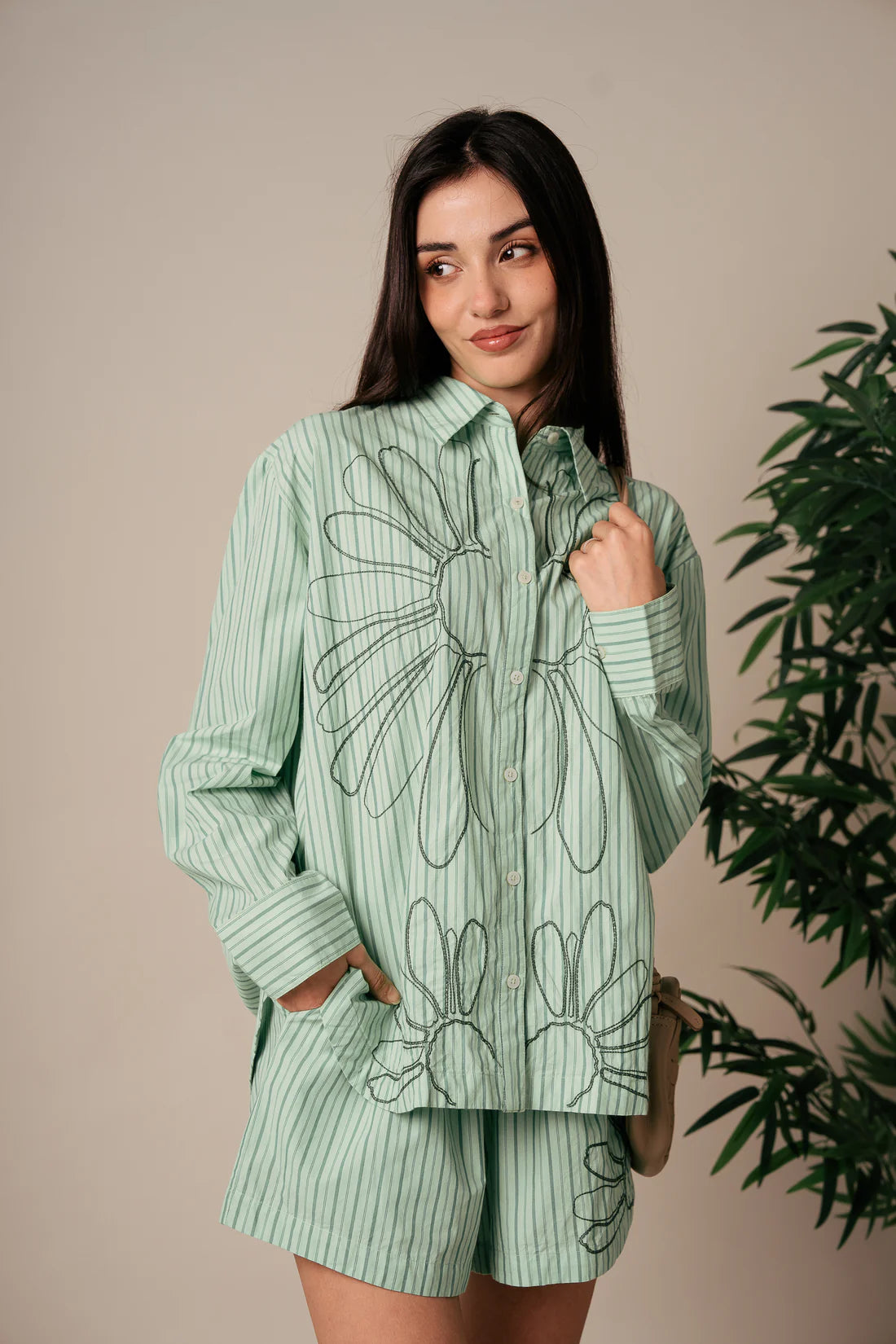 The Zinnia complete look set consists of a shirt and shorts. The shirt features green embroidery on the front and a button closure. The shorts have a tie belt. This casual set has a formal feel. The shirt is suitable for all kinds of occasions.